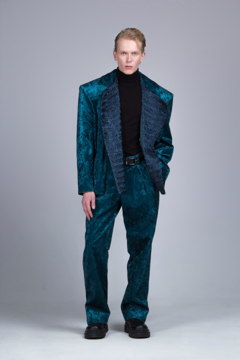 Ta unikalna marynarka oversize to propozycja dla osób ceniących odważne i nietuzinkowe projekty. Wyróżnia się szerokimi ramionami oraz dużymi klapami, które wykonano z materiału z odzysku, nadając projektowi ekologicznego charakteru. Na plecach znajduje się efektowne rozcięcie na zamek, co nadaje marynarce wyjątkowej oryginalności i dynamiki.